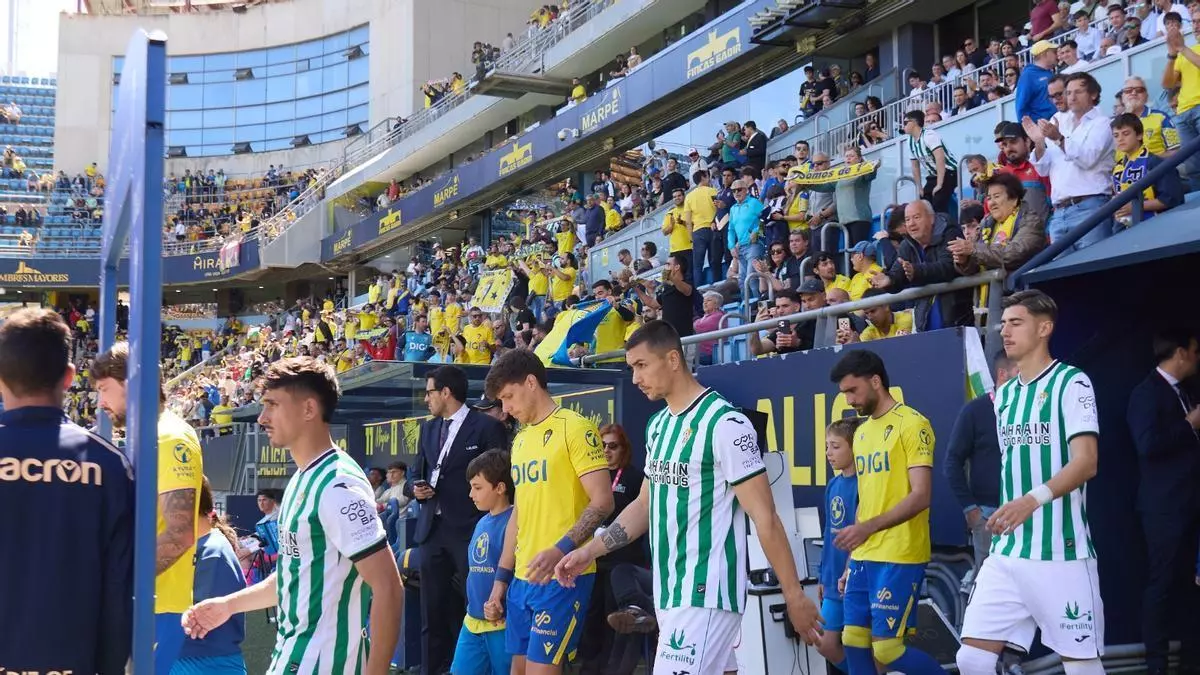 Jugadores del Córdoba CF y el Cádiz saltan al terreno de juego del Nuevo Mirandilla. / lof