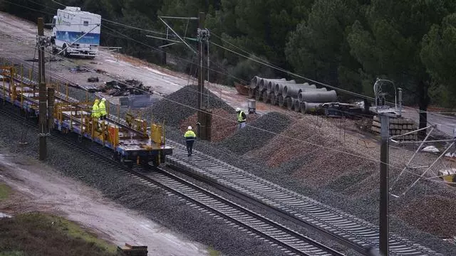 Operarios de Adif trabajan en la colocación de vías en el tramo afectado por el accidente, este lunes 2 de febrero. / SALAS / EFE