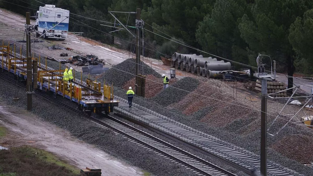 Operarios de Adif comenzaron este lunes la colocación de las vías en el tramo afectado por el descarrilamiento de dos trenes en Adamuz el pasado 18 de enero. Hasta el 28 de enero, hubo que esperar a la finalización de las labores de rescate y después a la autorización judicial, no comenzaron las tareas para recuperar el tramo, donde trabaja un equipo de unos 40 técnicos de Adif y una veintena de vehículos especializados. Ya se han retirado traviesas y carriles dañados y ahora se avanza en la colocación de las vías, así como en la reconstrucción de la catenaria.