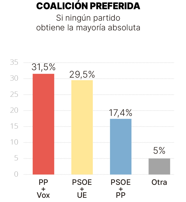 Ante la hipótesis de que ninguna fuerza alcance la mayoría absoluta, el sondeo pregunta directamente por la coalición de gobierno preferida. El resultado es revelador: un 31,5% de los encuestados se inclina por un acuerdo entre PP y Vox, frente a un 29,5% que opta por un pacto entre PSOE y Unidas por Extremadura. La diferencia entre ambos bloques es de apenas dos puntos porcentuales, una brecha mínima que, lejos de aclarar el escenario, subraya el grado de polarización existente.
