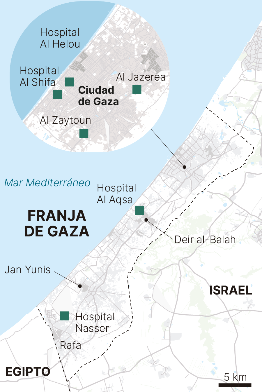 “Vamos a Ciudad de Gaza, pero tenemos que pasar por calles que no sabemos muy bien a dónde nos llevan. Nuestros conductores son de esa ciudad del norte de la Franja, pero ni ellos mismos a veces son capaces de reconocer dónde están. No tienen referencias, aquella tienda, aquella plaza, aquel edificio. Tenemos que parar y llamar para que nos digan por dónde seguir”.